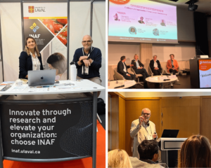 C’est sous la coordination d’Éliane Picard-Deland, coordonnatrice aux affaires internationales, que l’INAF a piloté une délégation composée de 13 personnes – industriels, partenaires (CRIBIQ, Créneau Agro Boréal, CIDAL, etc.) et membres de la direction et de chercheurs de l’INAF (Université Laval et INRS) pour assister à cette grande rencontre européenne sur l’innovation dans les domaines de l’alimentation humaine et animale, de la nutrition et de la santé. Nos collègues Yves Desjardins et Monique Lacroix ont figuré parmi les conférencières et conférenciers de l’événement, non sans fierté et sans rappeler l’expertise de niveau mondial de nos membres chercheurs. L’INAF a aussi profité de l’installation d’un kiosque pour promouvoir l’expertise de ses scientifiques, ses services ainsi que son événement phare BÉNÉFIQ2023. Cette présence aura permis aux membres de l’équipe de direction représentés par Renée Michaud, Laurélie Trudel et Éliane Picard-Deland de réseauter avec de nombreuses entreprises bioalimentaires européennes qui ont manifesté leurs intérêts pour initier des collaborations et participer à BÉNÉFIQ2023.