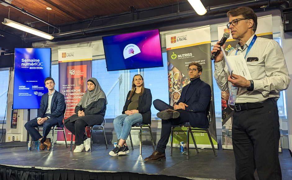 Le programme de la journée se terminait par le panel de discussion « Apprentissage en binôme collaboratif en IA et nutrition-santé : retours d’expériences », animé par Benoît Lamarche, directeur du Centre NUTRISS de l’INAF et Xavier Fresquet, directeur adjoint du SCAI . Ce panel réunissait plusieurs étudiantes et étudiants de l’INAF et du SCAI qui avaient participé à l’École d’été France-Québec Intelligence artificielle et nutrition-santé, en 2023.