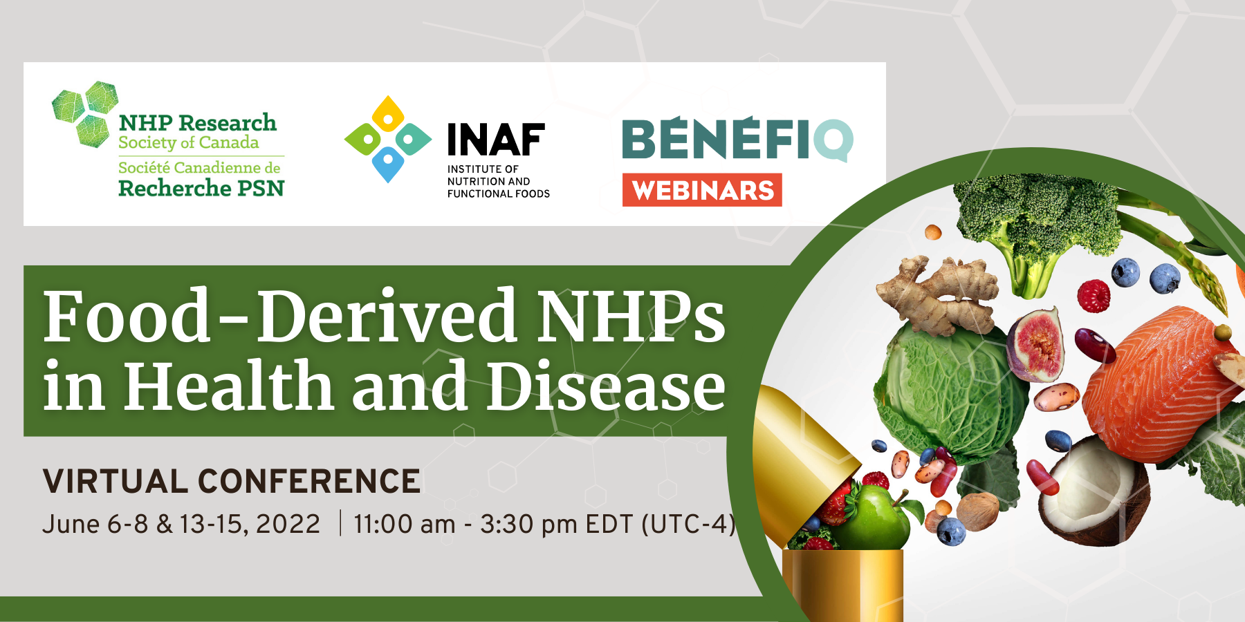 Co-organisé avec la Société canadienne de recherche PSN, cette conférence virtuelle traitera des avancées et des défis dans le domaine des produits de santé naturels d'origine alimentaire. ÉVÉNEMENT EN ANGLAIS.
