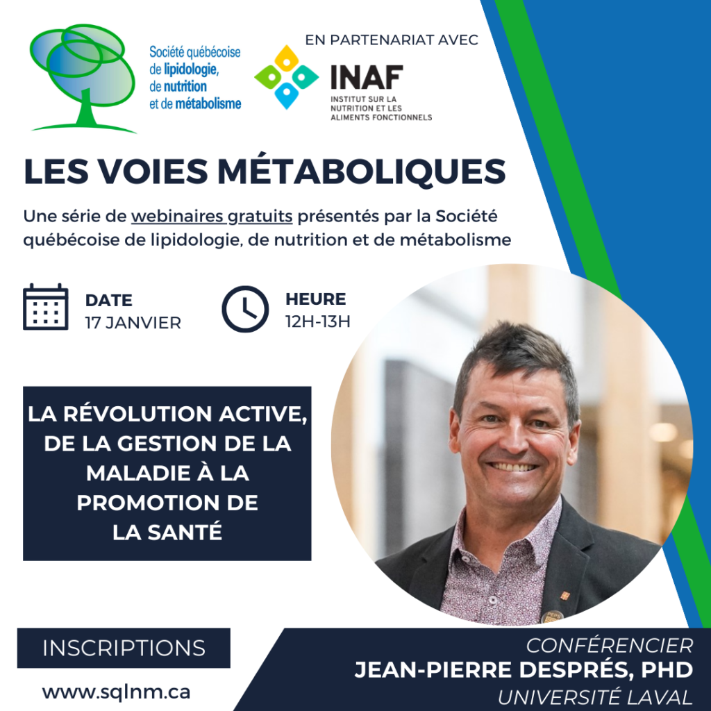 Jean-Pierre Després, Ph. D., professeur à l’Université Laval et directeur du centre VITAM, sera l’invité de Benoît Arseneault, coprésident de la SQLNM et membre-chercheur de l’INAF, pour discuter de la révolution active, de la gestion de la maladie à la promotion de la santé.